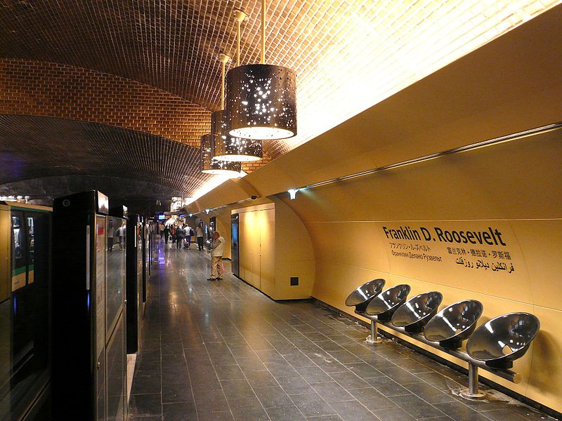 Métro station Franklin D. Roosevelt, located in the 8th arrondissement at the intersection of lines 1 and 9, was originally two different stations: Marbeuf and Rond-Point. The Marbeuf station was one of the first Métro stations to open—on July 19, 1900. It was named for rue Marbeuf, the street on which it was situated. The street itself was named for the Marquis de Marbeuf, who had developed the neighborhood during the 1770s and who, in recompense, was guillotined during the Reign of Terror. Distributing bread to the poor: good move; paving roads and building houses for the bourgeoisie: not so much.