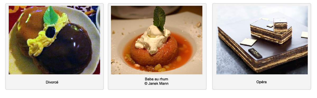 • Pâtes battues (“beaten batters”) are a family of leavened batters used to make other familiar cake-like desserts. The pâte génoise is one variety used for the dry cake that is layered with creams or icings in the fraisier, the Forêt noir, tiramisù, and the opéra, pictured above on the right. The pâte à madeleine is the variety used to make the cake-like dessert of the same name, pictured below on the left. The pâte à biscuit is the variety used to make cookies.